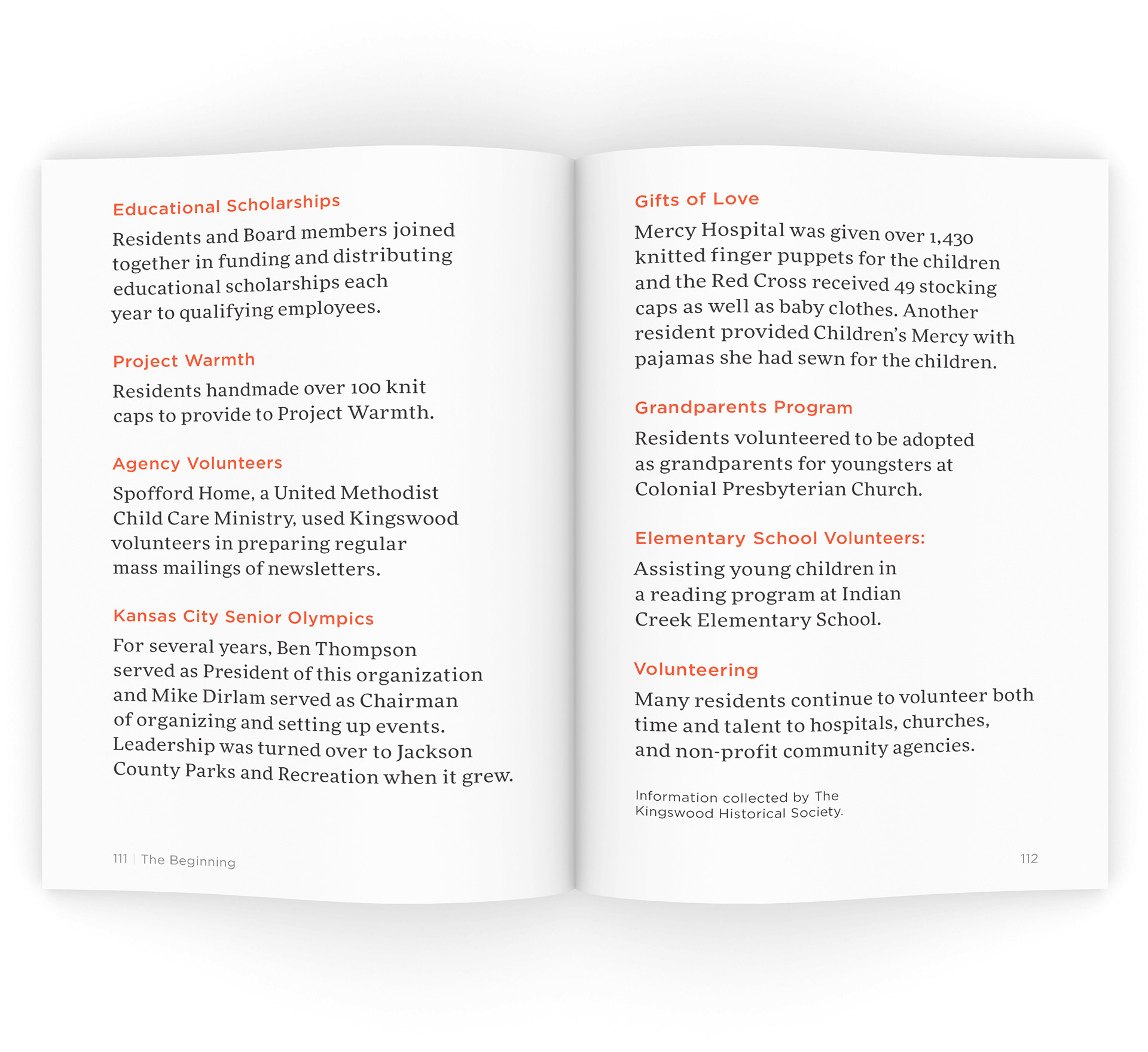 I was commissioned by the Kingswood Retirement Community Historical Society to design a book for the upcoming anniversary of the institution. Because much of the audience has visual and motor impairments, many design elements and techniques were not practical to use. From the beginning, my goal was for the book to be read without any visual aids. After all, this is how I read books, so I wanted to extend that pleasure to the audience of this book as well. Making typography accessible is not only about making type bigger. Large type sizes are only a small part of the picture. Choosing a typeface that is legible and readable is more of a factor. To that end, a typeface was chosen with unique and recognizable characters, long ascenders, used with expanded tracking, proper leading, and without ligatures, italics or bolding (as these can be a hindrance to legibility for those with visual impairments).