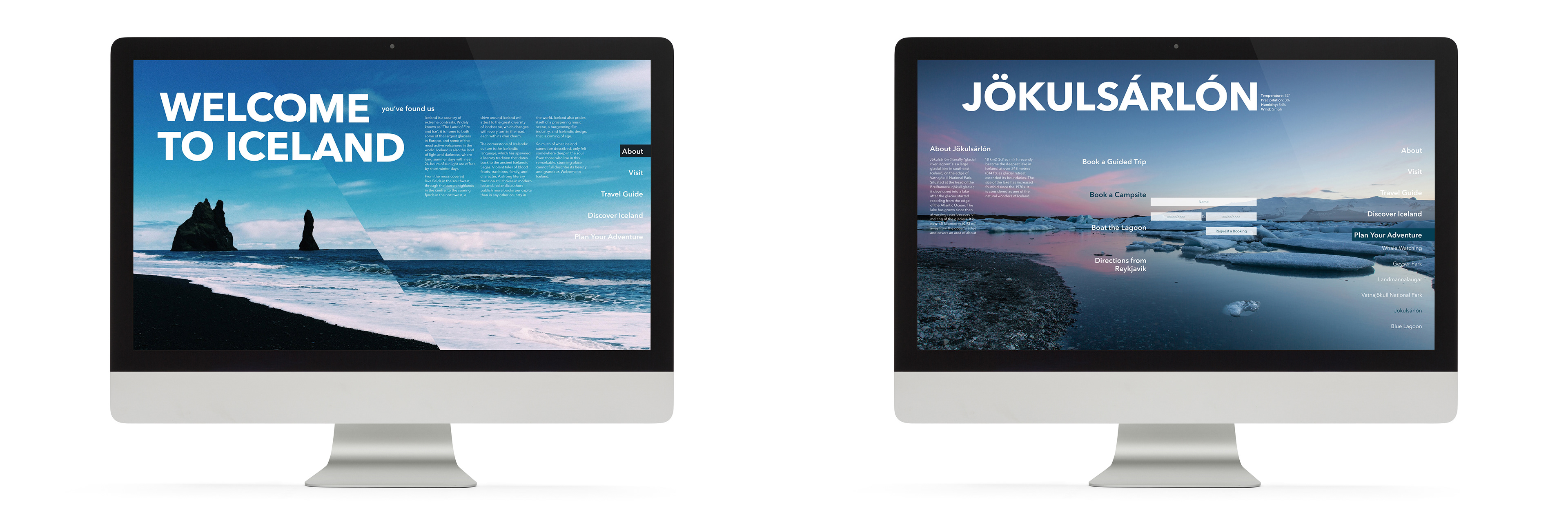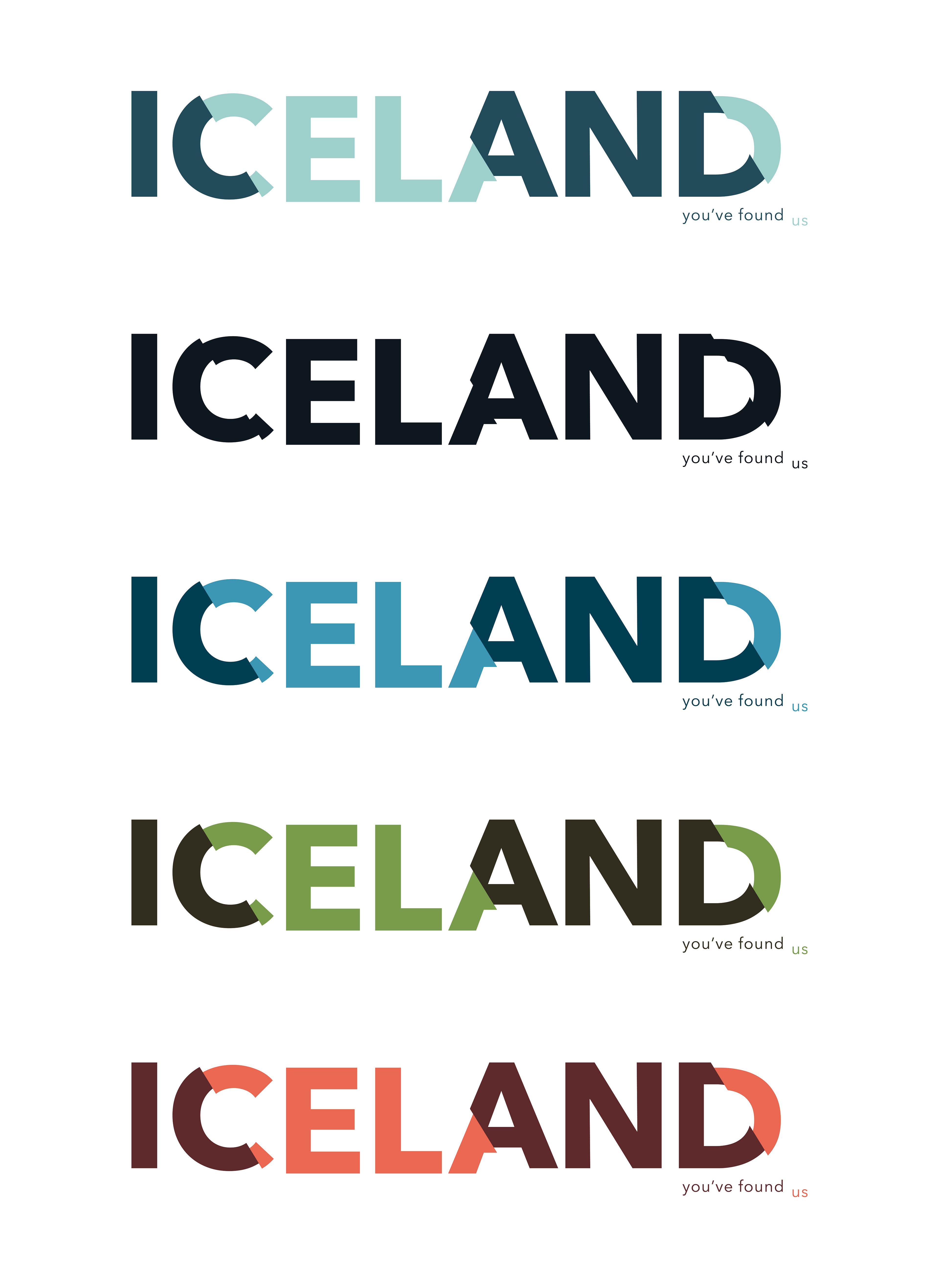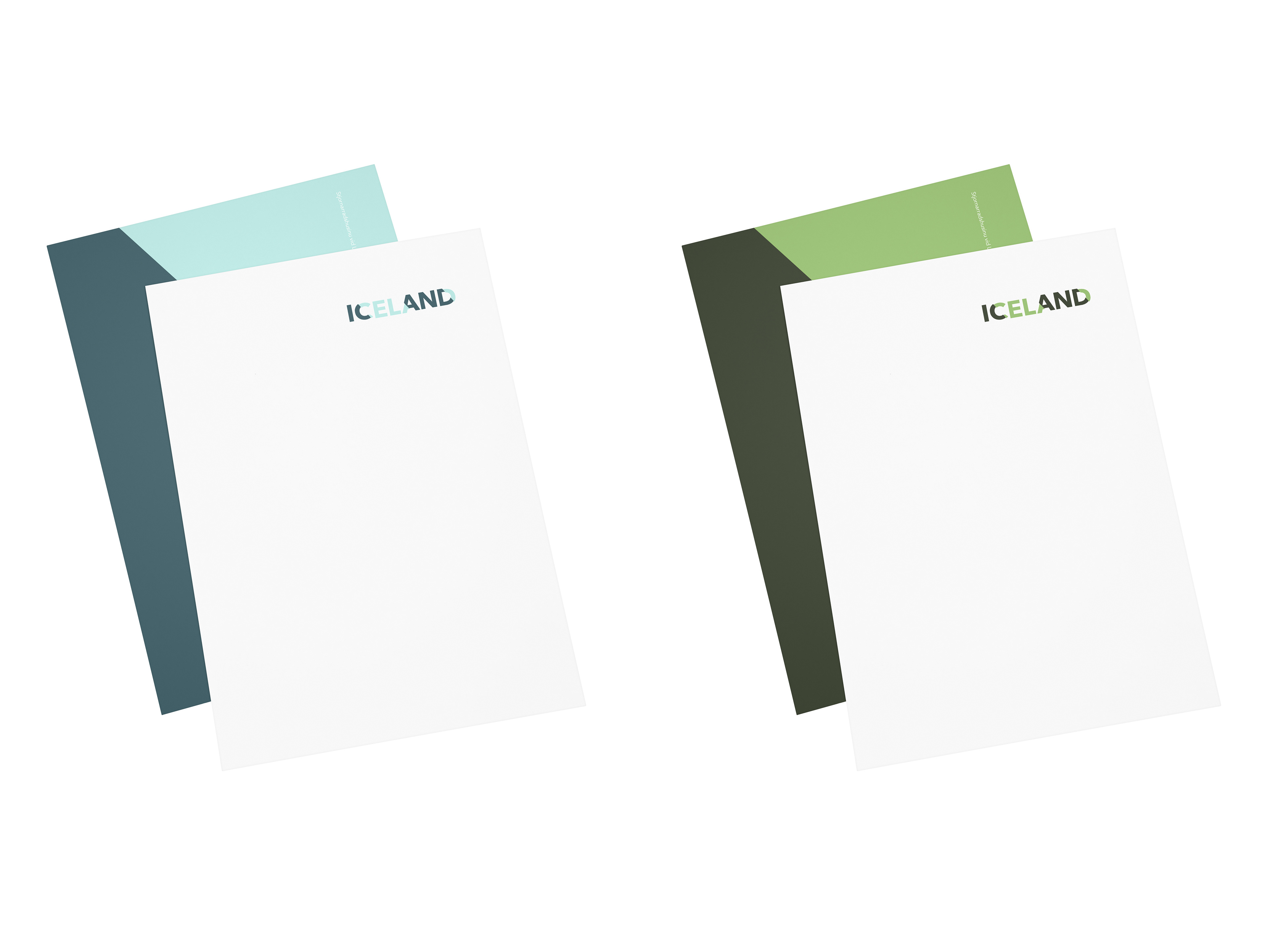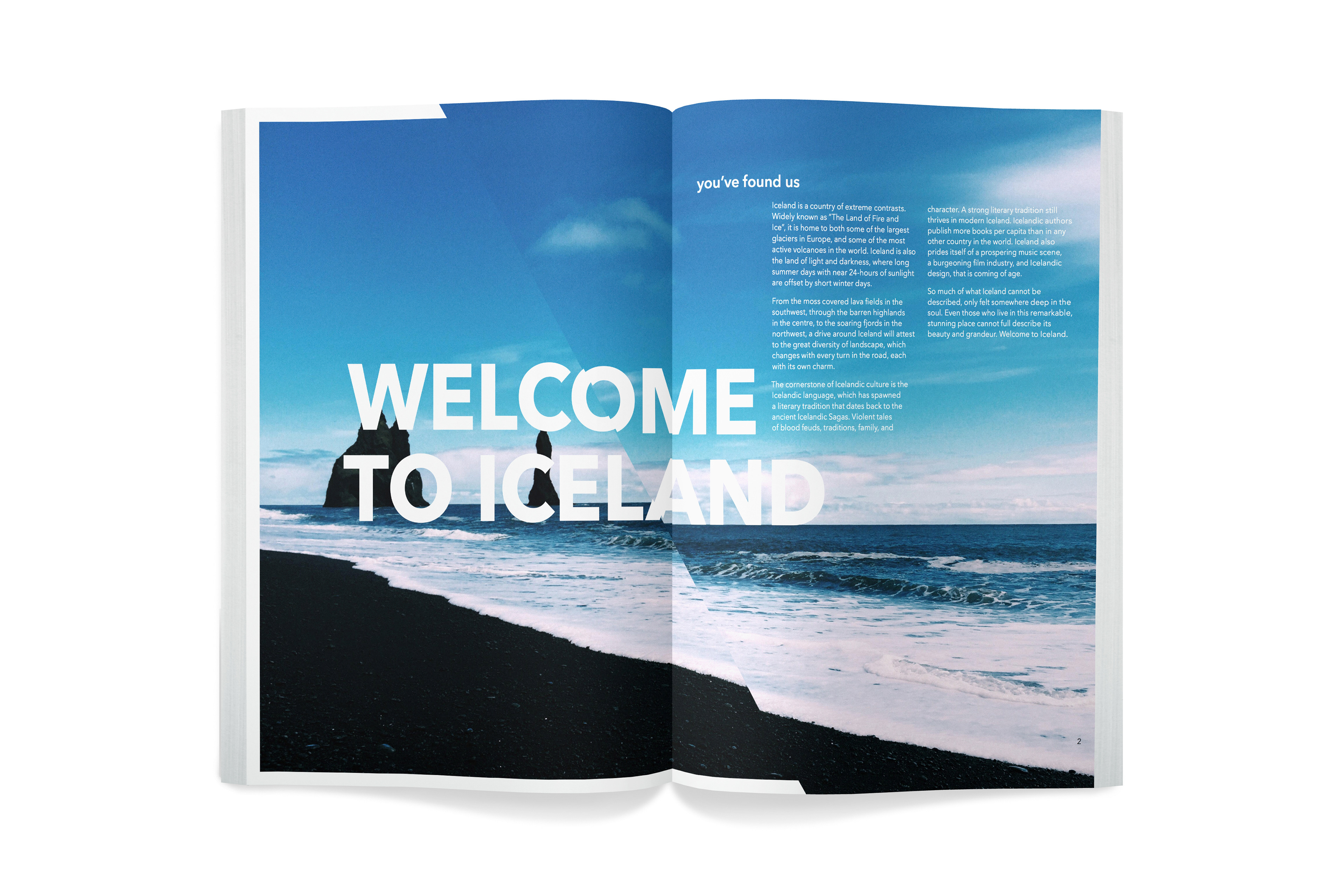 The goal for the Icelandic brand was to display the beauty and epicness of Iceland while staying uniquely Icelandic. The result is a brand that displays the grandeur of Iceland without distracting or becoming about itself. Iceland's topography ranges from stark ice wastelands to red-hot erupting volcanoes. Because of this dramatic shift, each region of Iceland was given a unique color palette. Included is a sample identity for the Iceland National Mail (The Fox). The Fox National Mail is an example of a possible application of the Icelandic brand using the brand attributes outlined in this book. The Fox utilizes the primary color palette, color fields, and type cut by the angle as well as the same typography rules as the main Icelandic brand. These attributes give this sub-brand its own feel, while still remaining confidently under the umbrella of the primary Icelandic brand.