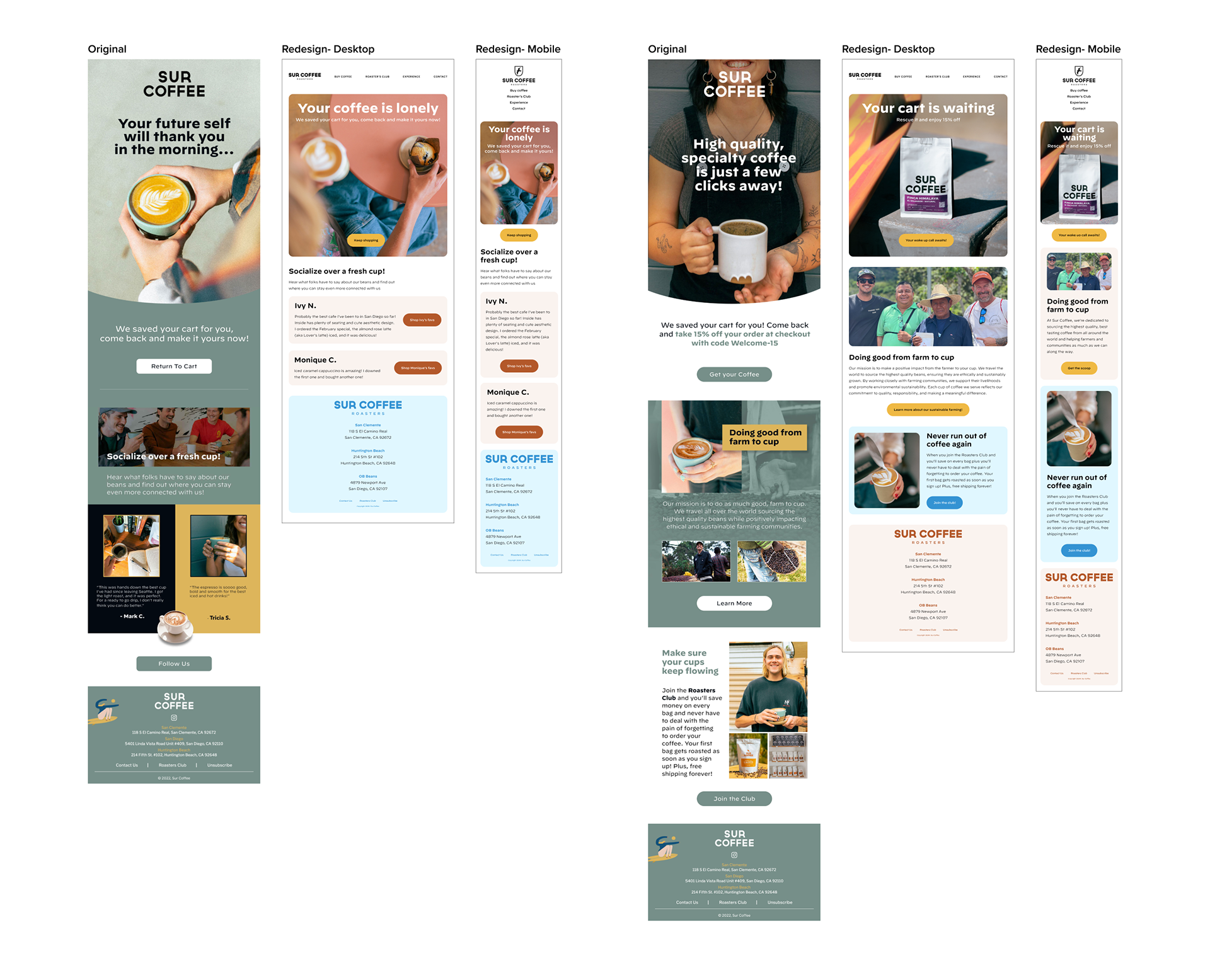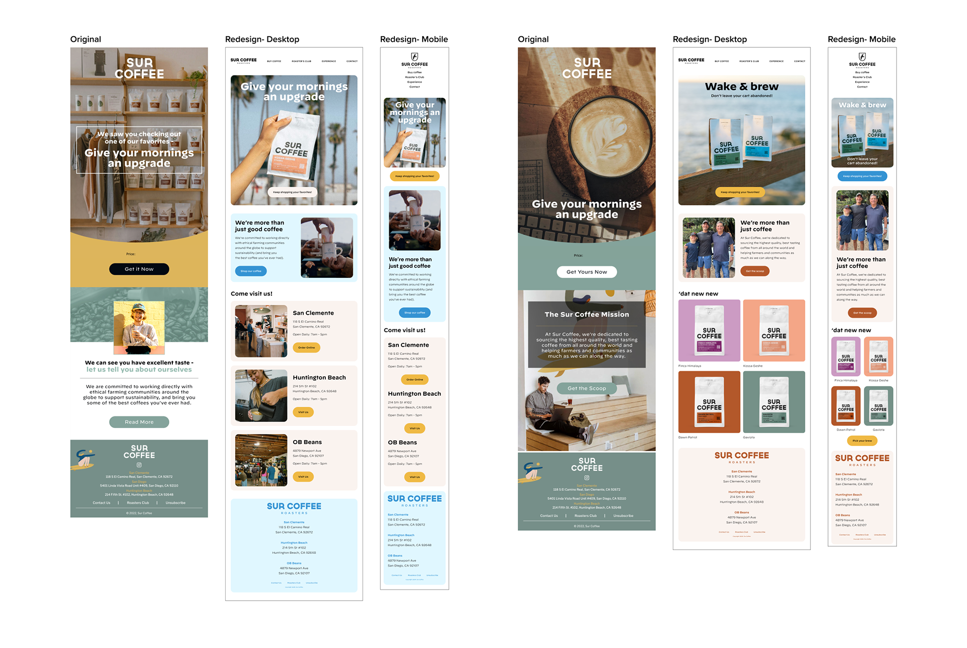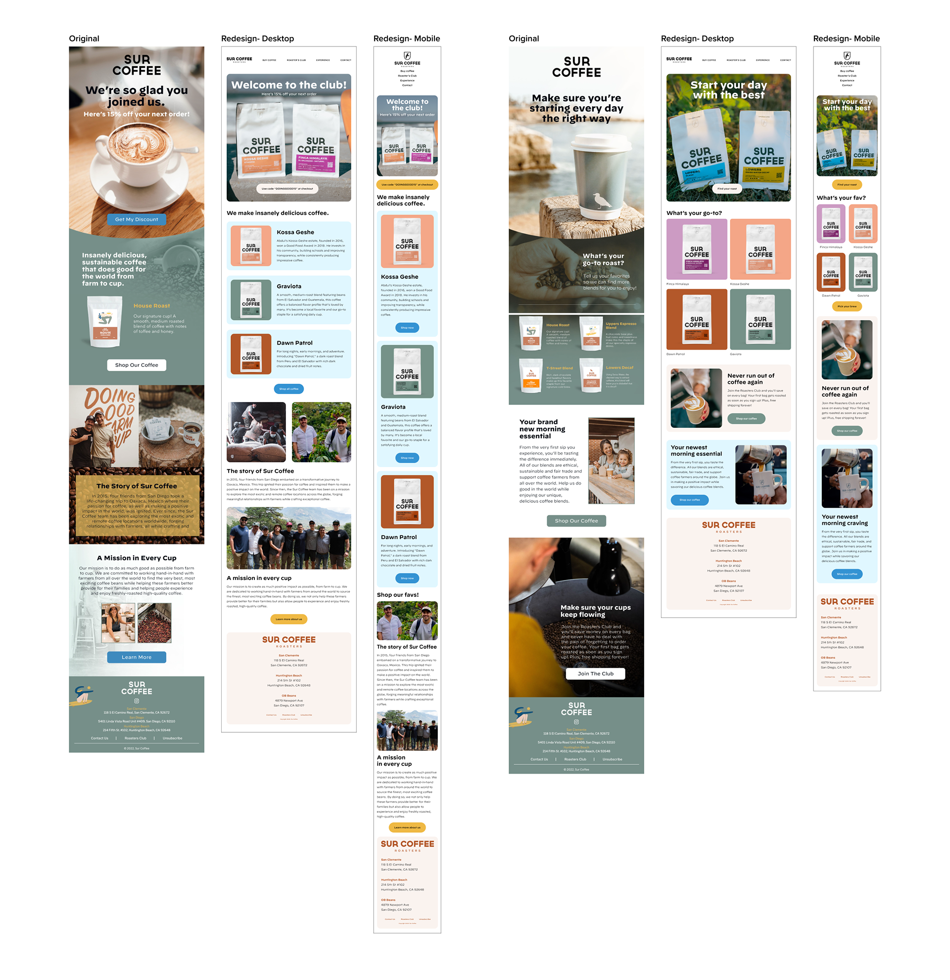 I directed the visual and UX approach for lifecycle email, auditing current flows, analyzing drop‑offs, and delivering a modular template system with a clean, modern layout and brand‑true voice in collaboration with copy; the system accelerated updates, ensured consistent aesthetics, and increased engagement while keeping Sur Coffee’s inviting tone.