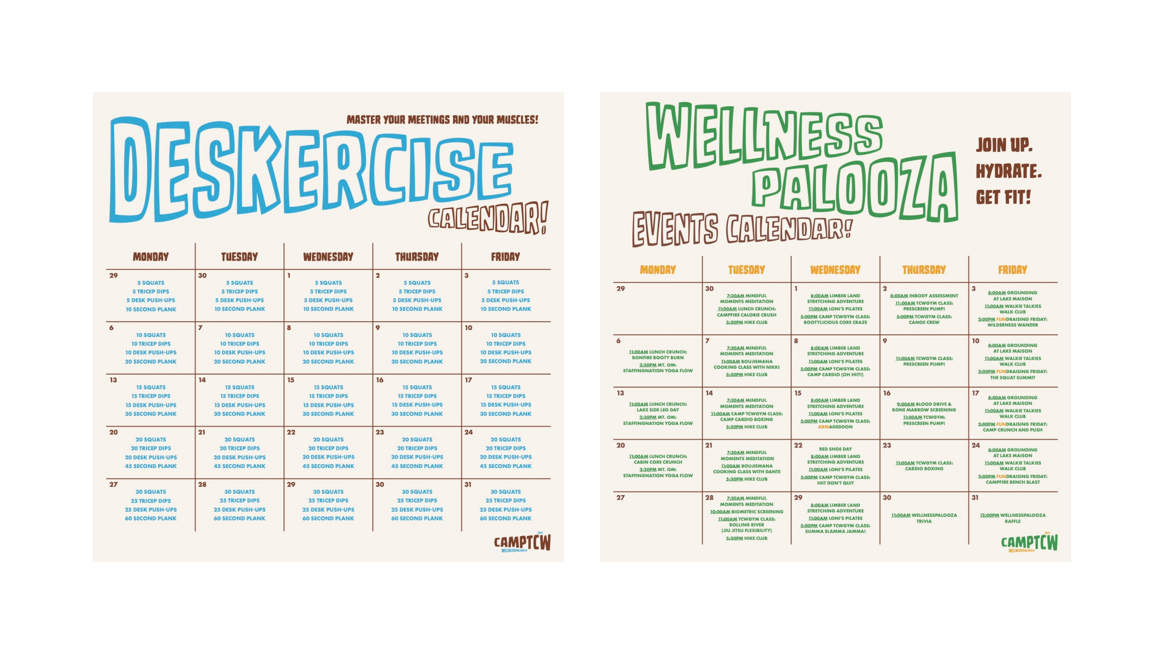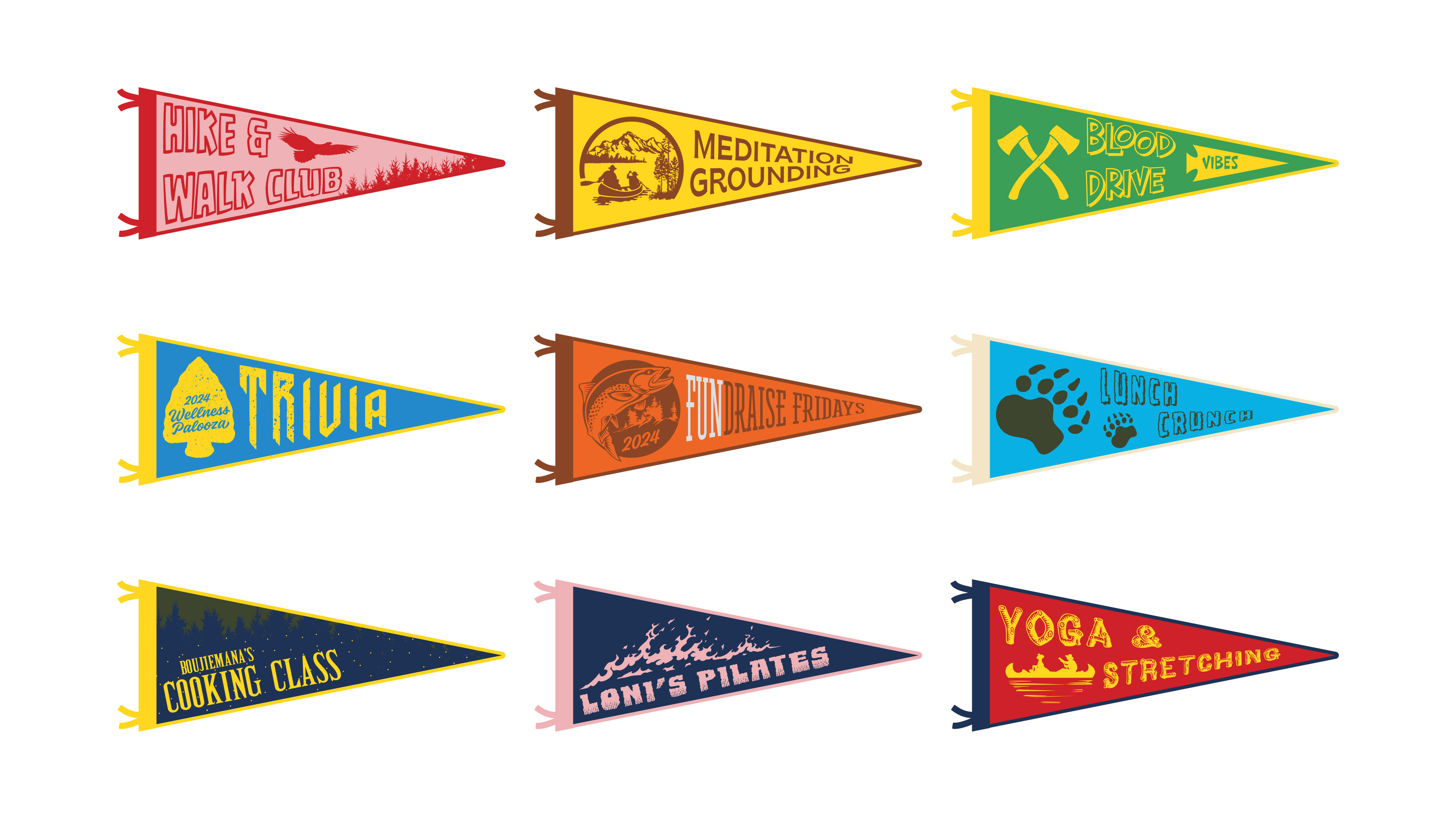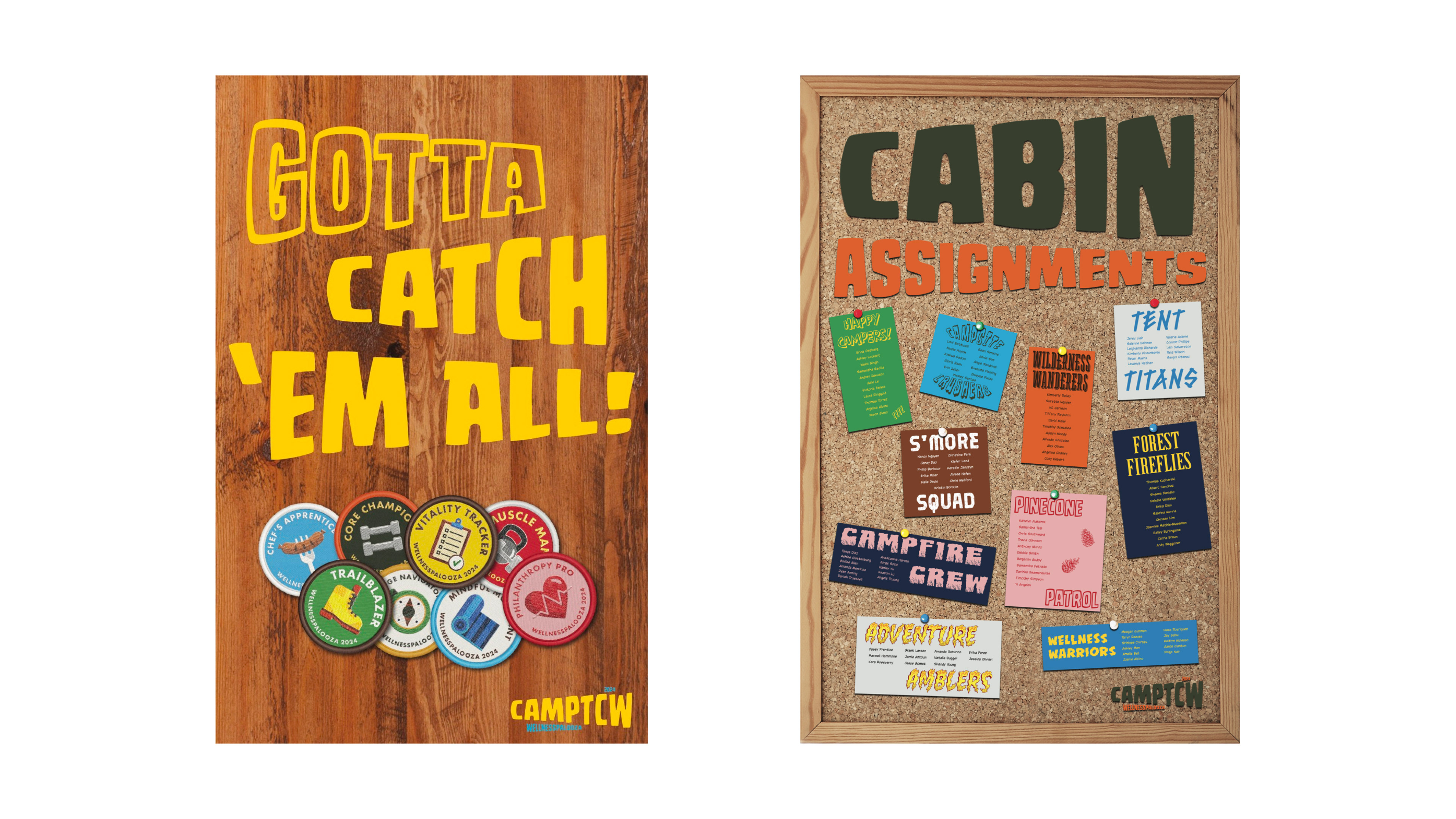 I steered a nostalgic summer‑camp identity—retro badge system, embroidered patches, pennants, banners, and posters—and delivered calendars, planners, and signage to drive participation; engagement stayed high and the theme unified the campus throughout the month.